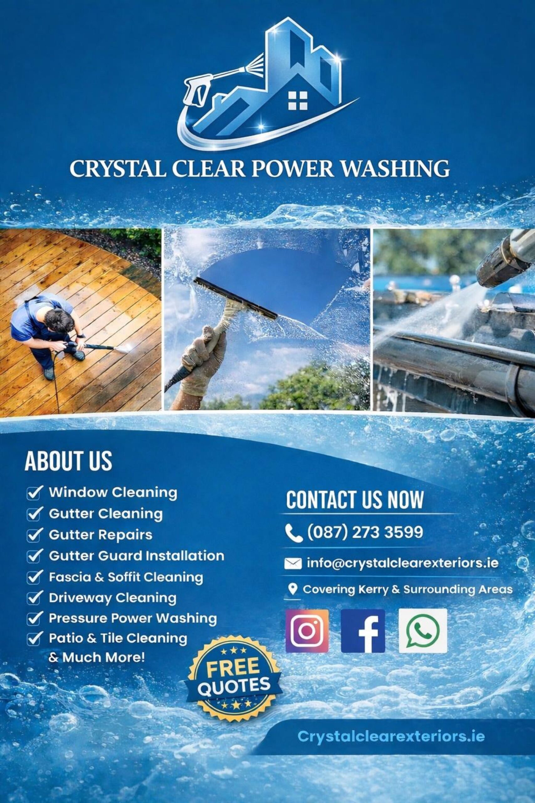 Crystal Clear Power Washing provides reliable exterior cleaning services across Kerry and the surrounding areas. From window and gutter cleaning to driveway and patio washing, we help restore the appearance of your property and keep it looking its best all year round. With professional equipment, attention to detail, and free quotes available, you can count on us for quality results every time.